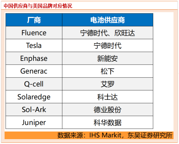 特斯拉采用宁德100ah的方形电池;Enphase采用新能安52ah的软包电池;Generac从松下的三元电池模组转向国内企业代工;韩国Q-cell品牌找杭州艾罗(Solax)代工;SolarEdge与时代科士达以ODM模式合作,德业给Sol-Ark做代工,科华数据为Juniper做代工。