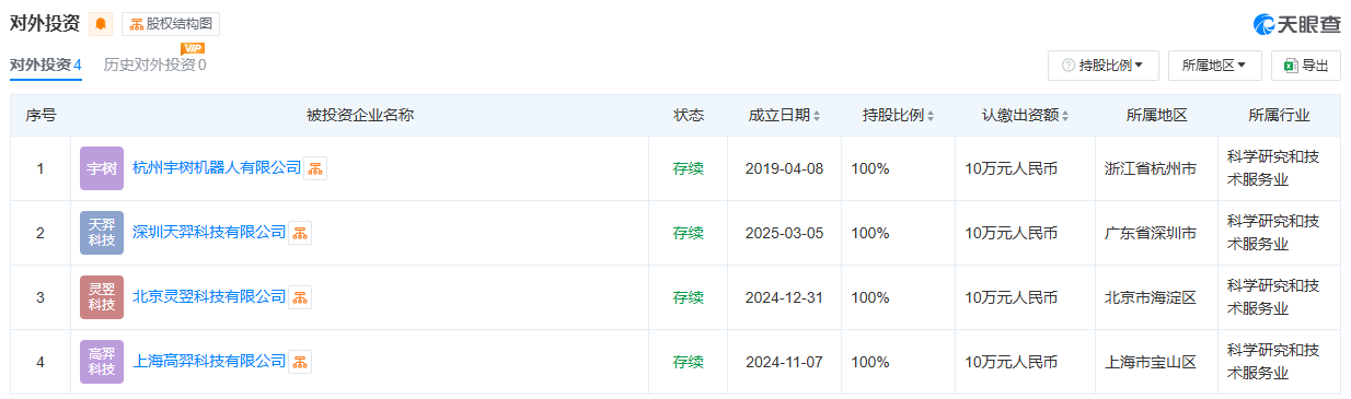 天眼查显示,目前,宇树科技已对外投资包括杭州宇树机器人有限公司、深圳天羿科技有限公司、北京灵翌科技有限公司、上海高羿科技有限公司等4家公司。