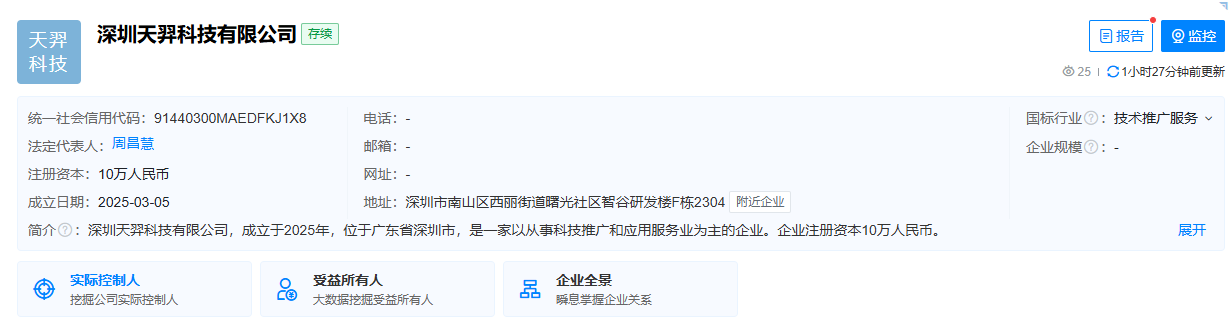 据天眼查显示,近日,深圳天羿科技有限公司成立,注册资本10万元,法定代表人周昌慧,经营范围包含智能机器人的研发;智能机器人销售;工业机器人销售等,由杭州宇树科技有限公司全资持股。