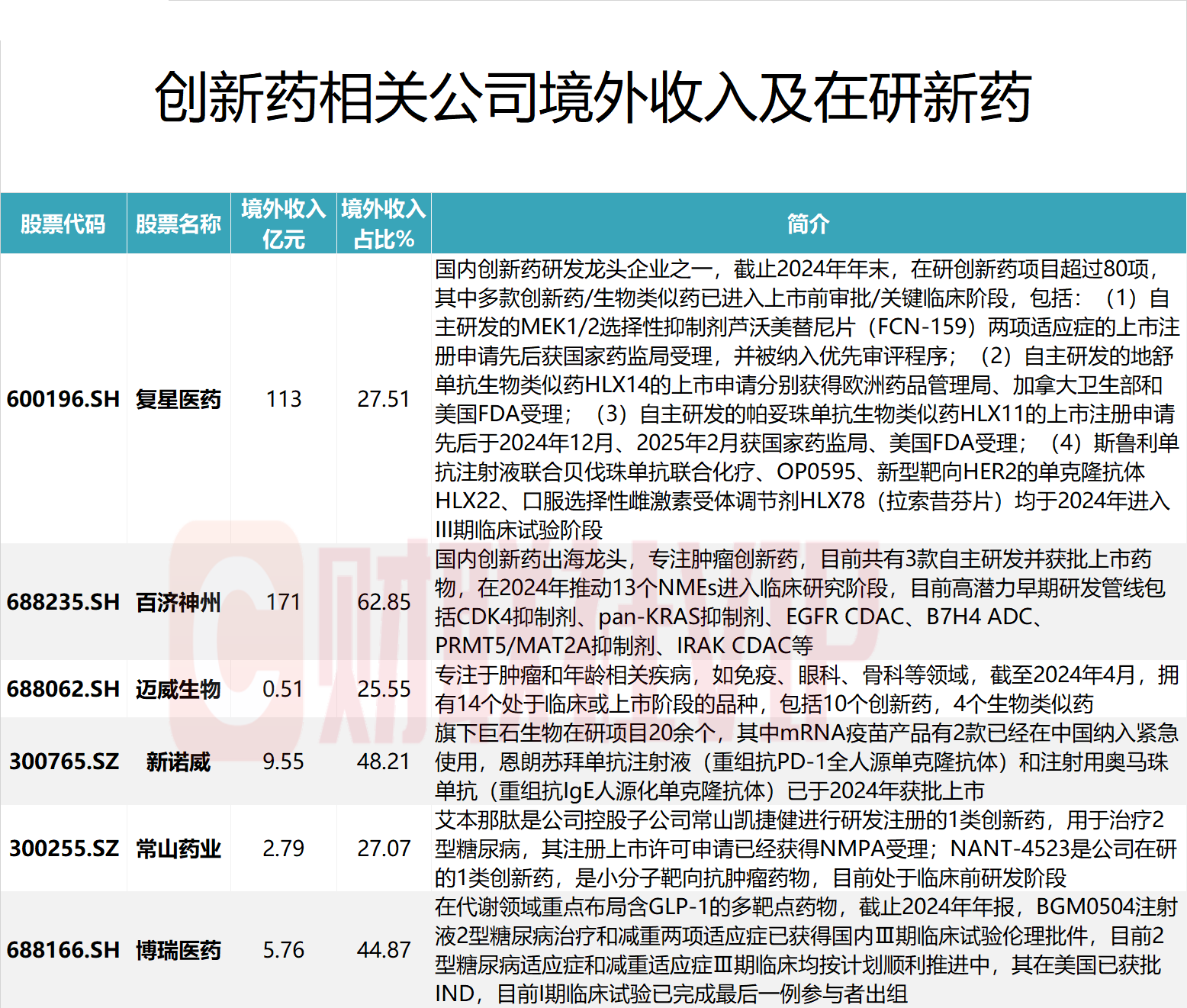 据梳理,创新药上市公司中,境外收入占比超20%的A股公司包括百济神州、新诺威、博瑞医药、复星医药、常山药业和迈威生物,具体情况见下图: