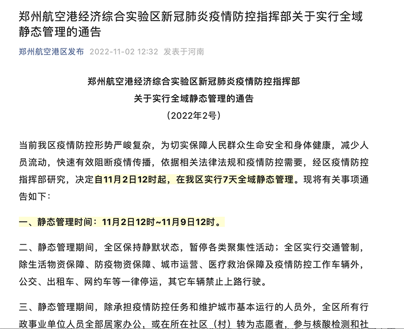 根据郑州航空港区新冠肺炎疫情防控指挥部11月2日发布最新政策,该区域自11月2日12时起实行7天全域静态管理。静态管理期间,全区保持静默状态,暂停各类聚集性活动。