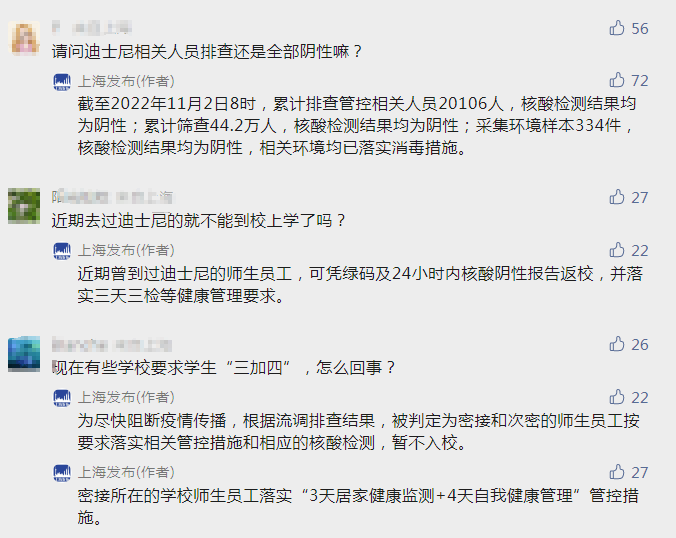 还有网友提问,请问迪士尼相关人员排查还是全部阴性嘛?上海发布表示,截至2022年11月2日8时,累计排查管控相关人员20106人,核酸检测结果均为阴性;累计筛查44.2万人,核酸检测结果均为阴性;采集环境样本334件,核酸检测结果均为阴性,相关环境均已落实消毒措施。