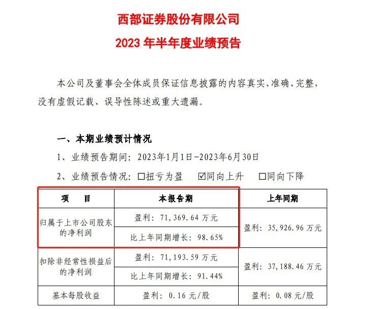 西部证券预计今年上半年净利润7.14亿元,同比增长98.65%。