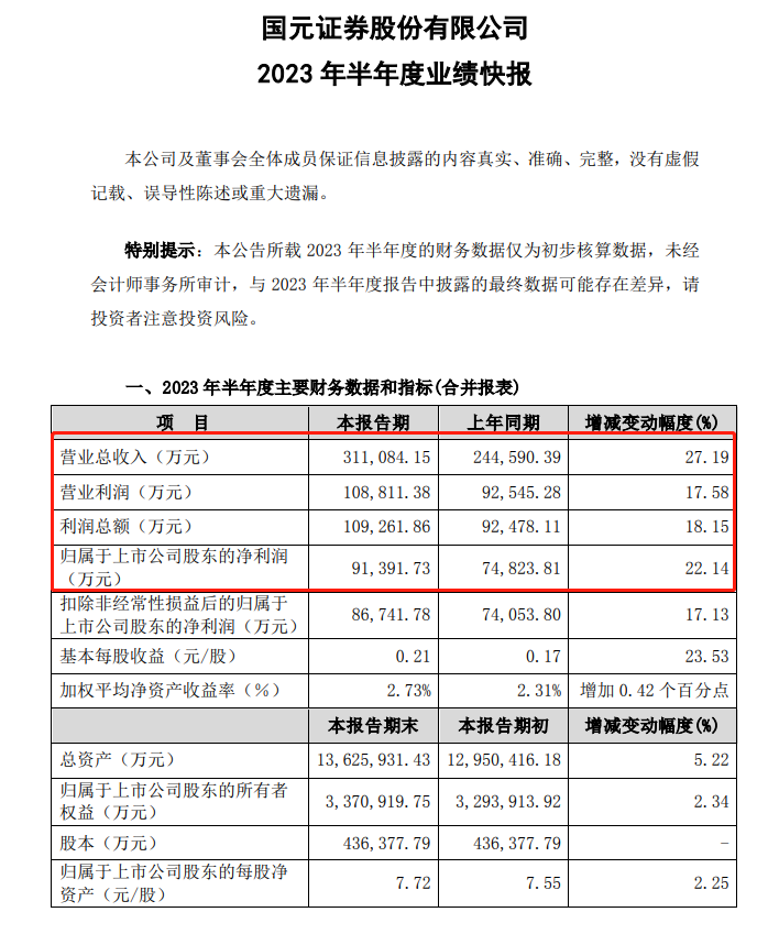 国元证券在7月11日发布的业绩快报显示,上半年实现营业总收入31.1亿元,同比增长27.19%;净利润9.14亿元,同比增长22.14%。