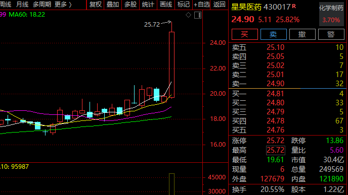 医药生物股早间全线走强,创新药方向领涨,板块指数放量大涨逾4%,创历史新高,半日成交接近前一交易日全天成交。星昊医药冲击30%涨停,海辰药业、睿智医药等多股20cm封板,众生药业等近20股亦强势涨停或涨超10%。