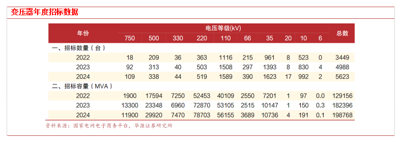 2023年、2024年各类变压器的招标数量均有较大幅度提升,其中750kV提升尤为明显,与大量西北特高压外送建设相关。