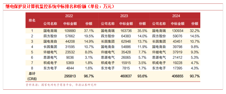 继保份额方面,国电南瑞、四方股份稳居前2,思源电气提升明显。继电保护上市公司优势明显,2022—2024年排名前8的公司均为上市公司,其中国电南瑞、四方股份稳居前2且优势明显。思源电气进步较快,2022年份额占比仅3.1%,到2024年提升到5.3%。