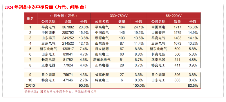 组合电器集中度高于变压器,平高、西电、思源优势明显。组合电器中标排名前4的公司为平高电气、中国西电、山东泰开、思源电气,4家公司优势较为明显,且组合电器相比变压器有更高的集中度,总体CR10高达90.5%。330-750kV的超高压设备中,平高电气、中国西电、思源电气排名前3。