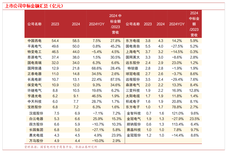 上市公司中,中国西电、平高电气、特变电工、思源电气、国电南瑞中标金额排名前5。而以2024中标金额/2023年公司总营业收入来看,长高电新、平高电气、保变电气、思源电气、国网信通、中国西电等公司占比较高,均超过了25%,可见上述公司在国网总部的中标金额对公司营收具有较高的指导意义。