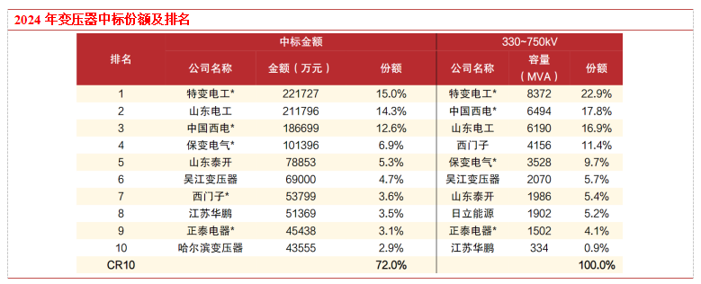 2024年变压器中标金额排名前5的公司分别为特变电工、山东电工、中国西电、保变电气、山东泰开,CR10为72%,集中度较高。330-750kV的超高压变压器,CR10为100%,集中度最高。