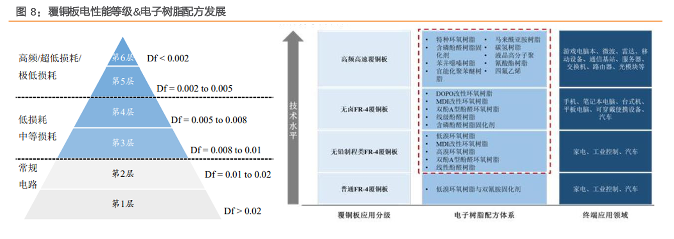 图:覆铜板电子性能等级和不同领域对电子树脂的要求