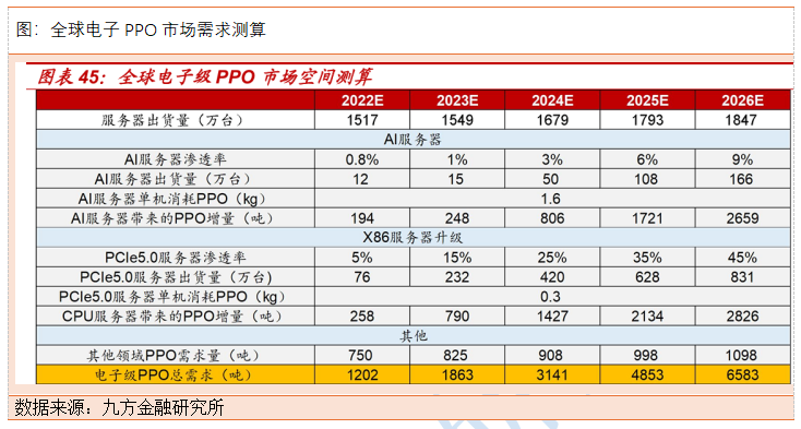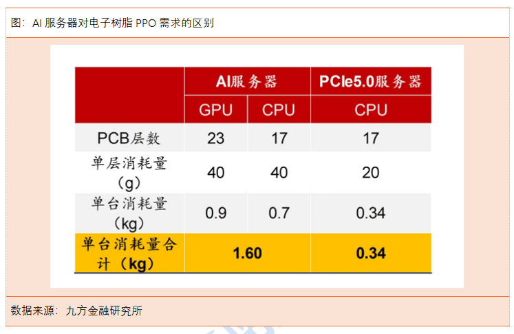 以常用的PPO树脂来看单台AI服务器和普通服务器的PPO耗用量分别约1.60kg、0.34kg。相较普通服务器,AI服务器增加了GPU加速卡,将在两方面带动树脂用量的提升:1)PCB层数增加 ,AI 服务器用PCB一般具有20-28层,而普通服务器则在12-16层。我们取相应PCB层数中位数,假设AI服务器GPU、CPU主板和PCIe5.0服务器CPU主板用 PCB层数分别约24层、18层、18层(对应半固化片23层、17层、17层)。2)PCB板面积增加 ,GPU模块加入使得AI服务器新增GPU模组板并需要更大面积主板。据诺德新材专利说明书,一般制造一片半固化片需要PPO 树脂约15-50g,考虑到AI服务器面积更大,我们假设AI服务器GPU、CPU 主板和PCIe5.0服务器CPU主板的PCB单层耗用量分别约40g、40g、20g。单台AI服务器和PCIe5.0普通服务器的PPO耗用量分别约 1.60kg、0.34kg。