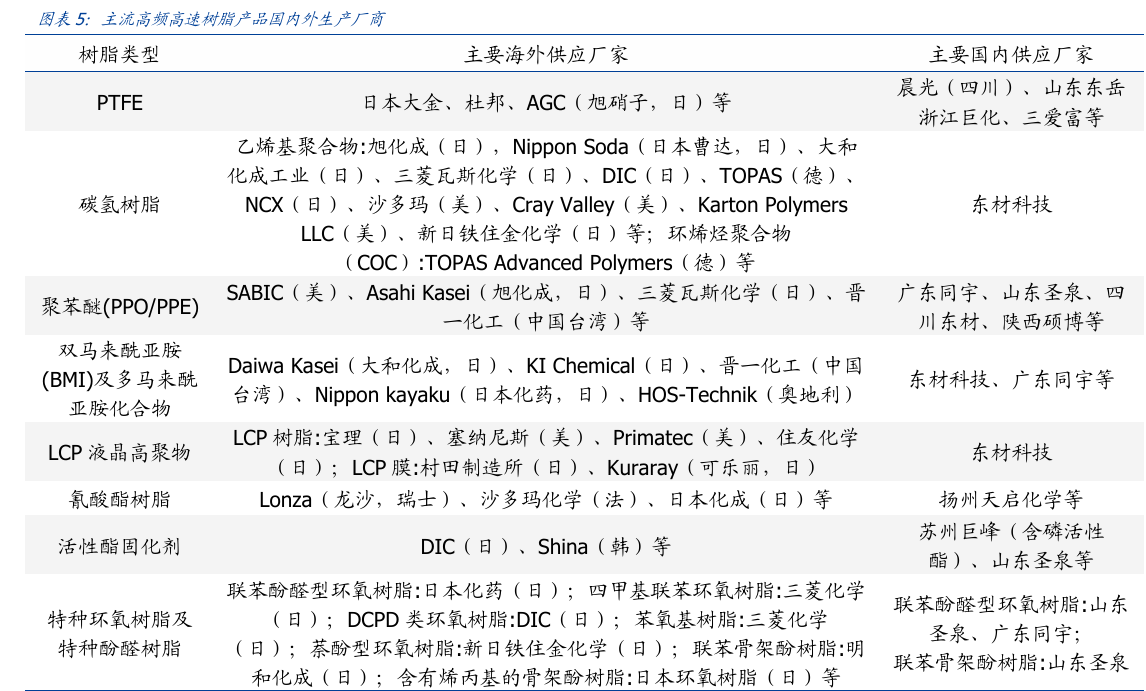 高频高速树脂目前主要被 SABIC、旭化成等外企垄断,国内领先厂商已具备产业化能力,有望迎来全新成长机遇。高频高速覆铜板对于树脂Dk、Df值要求严苛,PPO、BMI、活性酯等特种树脂渗透率有望持续提升。AI服务器推动电子树脂材料迭代的同时,也使得材料国产替代的诉求愈加迫切。高频高速树脂长期被海外企业垄断,其中美国SABIC 在PPO 树脂领域领军全球,日本旭化成、三菱瓦斯(自用为主)也具备量产供应能力。目前国内圣泉集团、东材科技、山东东岳、宏昌电子等企业经前期研发积累,已逐渐具备产业化能力,开始进行国产替代。