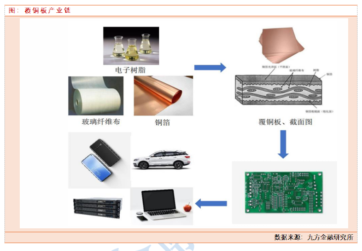电子树脂主要用于生产PCB原料覆铜板。应用于覆铜板生产的电子树脂一般是指通过选择特定骨架结构的有机化合物(如四溴双酚 A)和有反应活性官能团的单体(如环氧氯丙烷),经化学反应得到特定分子量范围的热固性树脂,是能够满足不同覆铜板所需要的物理化学特性需求的一类有机树脂材料。