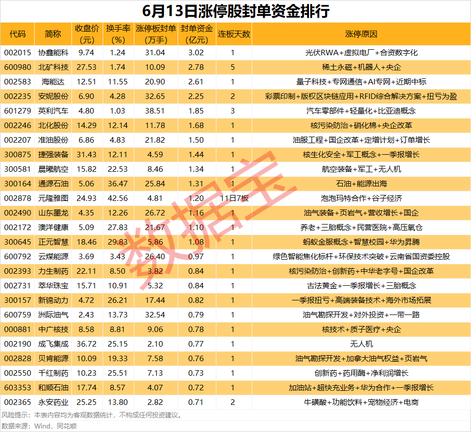 以封单金额计算,14股封单资金超1亿元,协鑫能科、北矿科技、海能达封单资金居前,分别为3.02亿元、2.78亿元、2.61亿元。