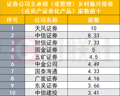 主承销(或管理)乡村振兴债券(或资产证券化产品)金额方面,中信证券、中信建投、国泰海通、天风证券和华泰联合摘得前五。