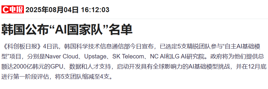 财联社去年8月曾介绍过,韩国科学技术信息通信部当时宣布,已选定5支精锐团队参与“自主AI基础模型”项目,分别是Naver Cloud、Upstage、SK Telecom、NC AI和LG AI研究院。