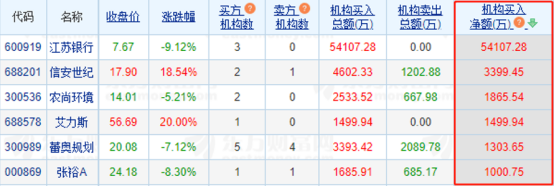 2)龙虎榜机构动向:4月26日,机构参与龙虎榜中个股共涉及36股,其中6股被机构净买入超1000万元,江苏银行被买入最多,为5.41亿元。