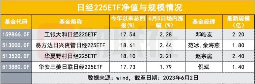 Wind数据显示,当前国内共有工银大和日经225ETF、易方达日兴资管日经225ETF、华夏野村日经225ETF和华安三菱日联日经225ETF等4只跟踪日经指数的公募基金,截至6月2日,上述4只基金今年以来总回报均接近20%,分别为17.54%、18.61%、18.1%和17.73%。粗略计算,4只基金涨幅已经超过全市场九成以上的ETF表现。