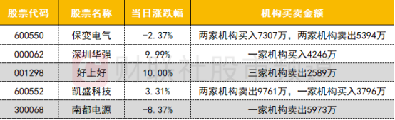 龙虎榜机构活跃度一般,买入方面,控股股东变更的保变电气获机构买入超7000万,同时遭机构卖出超5000万;深圳华强获机构买入超4000万。