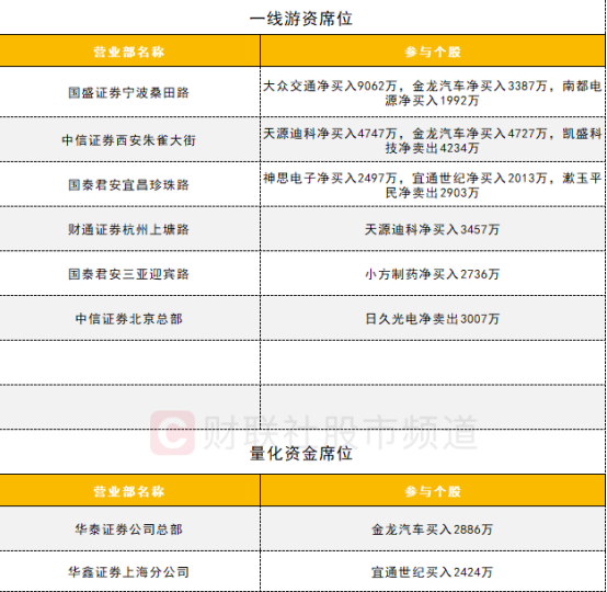 一线游资活跃度有所提升,大众交通获国盛证券宁波桑田路买入超9000万;金龙汽车、天源迪科均获两家一线游资席位买入。