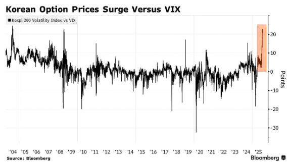 行情数据显示,韩国KOSPI 200指数的波动率指标(VKOSPI)目前已跃升至了4月特朗普关税引发全球市场暴跌时的水平。