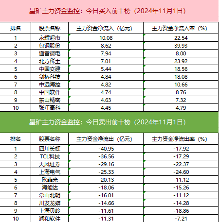主力资金流出前十的个股中高位股较多,四川长虹净流出居首。
