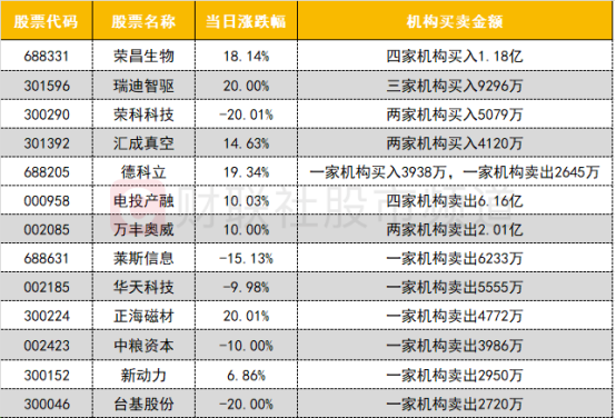 今日龙虎榜机构活跃度有所提升,买入方面,创新药概念股荣昌生物获机构买入1.18亿;次新股瑞迪智驱获机构买入超9000万;跌停的荣科科技获机构买入超5000万。