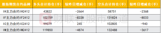 四大期指主力合约中,IH、IF、IM合约多空双方均减仓,且多头减仓数量均较多;IC合约多头小幅加仓,空头小幅减仓。