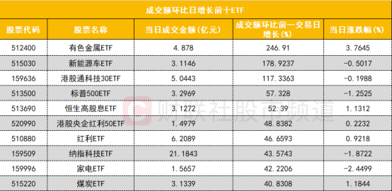 从成交额环比增长前十的ETF来看,有色金属ETF(512400)成交额环比增长246%位居首位;新能源车ETF(515030)成交额环比增长178%位居第二位。