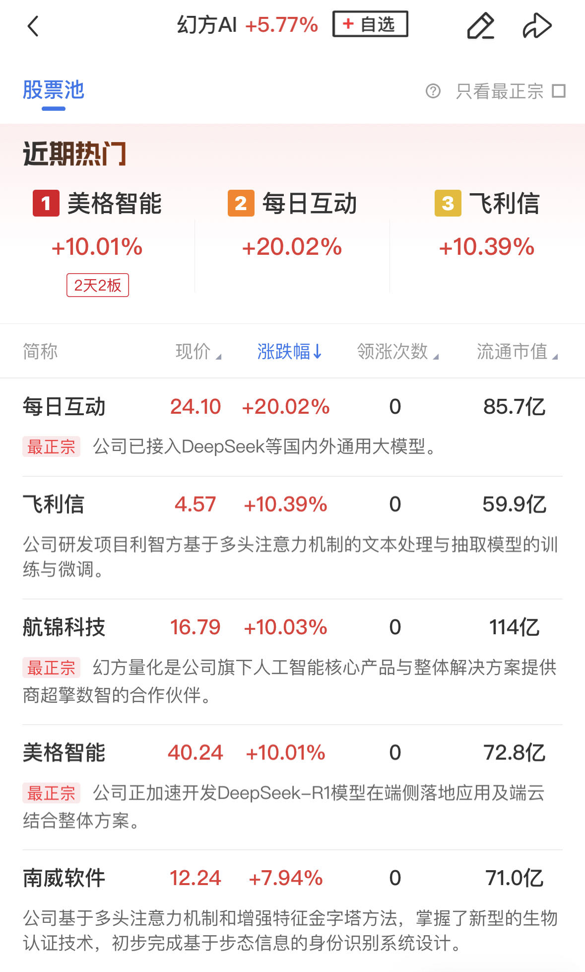 板块上,Deep Seek概念股全线爆发,每日互动、航锦科技、美格智能、飞利信等涨停,卓创资讯、拓尔思、南威软件等个股涨幅居前。