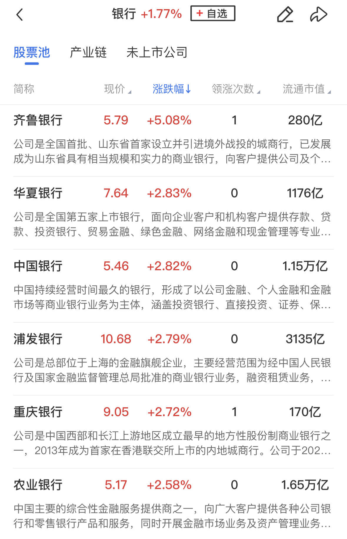 银行股再度活跃,齐鲁银行涨超5%,浦发银行、华夏银行、农业银行、青岛银行、工商银行等个股涨幅居前。