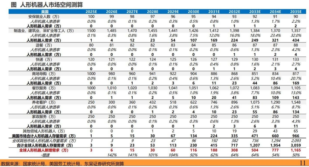 出生率下降、人力成本抬升,人形机器人空间广阔。我们按照美国的安保、第二产业、送餐、快递、商场导购、餐饮服务、看护、家政及其他领域就业人数及渗透率测算出美国机器人市场需求,其他市场按照中国需求的1.5倍进行预测,预测全球25年人形机器人初步商业化,销量3万台左右,30年这些领域就渗透率1.5-2%对应存量需求230万台,新增需求100万台+,2035年销量有望突破1000万台。