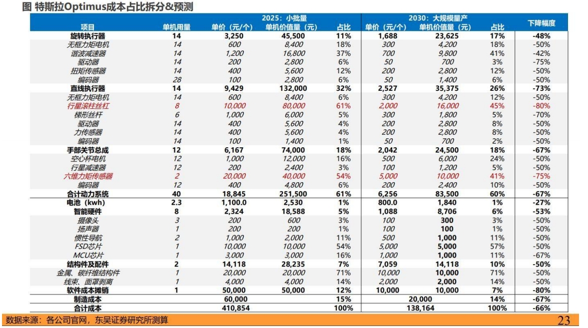 人形机器人成本拆分预计:主要包括动力总成系统(60%,电池系统+各关节机电执行器)、智能感应系统(15%)、结构件及其他(10%)、制造成本(15%),其中行星滚柱丝杠、六维传感器降本空间大。我们测算2025年小批量生产时,单个机器人成本40万元以上,2030年之后大规模量产成本有望降低至13-14万元。
