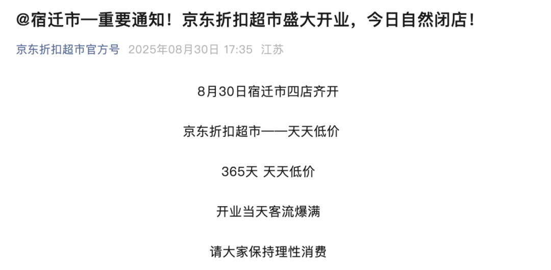 据悉,8月30日,宿迁京东折扣超市宿城希望城店、沭阳中央商场店、泗洪吾悦店、泗阳阳光里店四店齐开。京东折扣超市官方号显示,开业当天客流爆满。