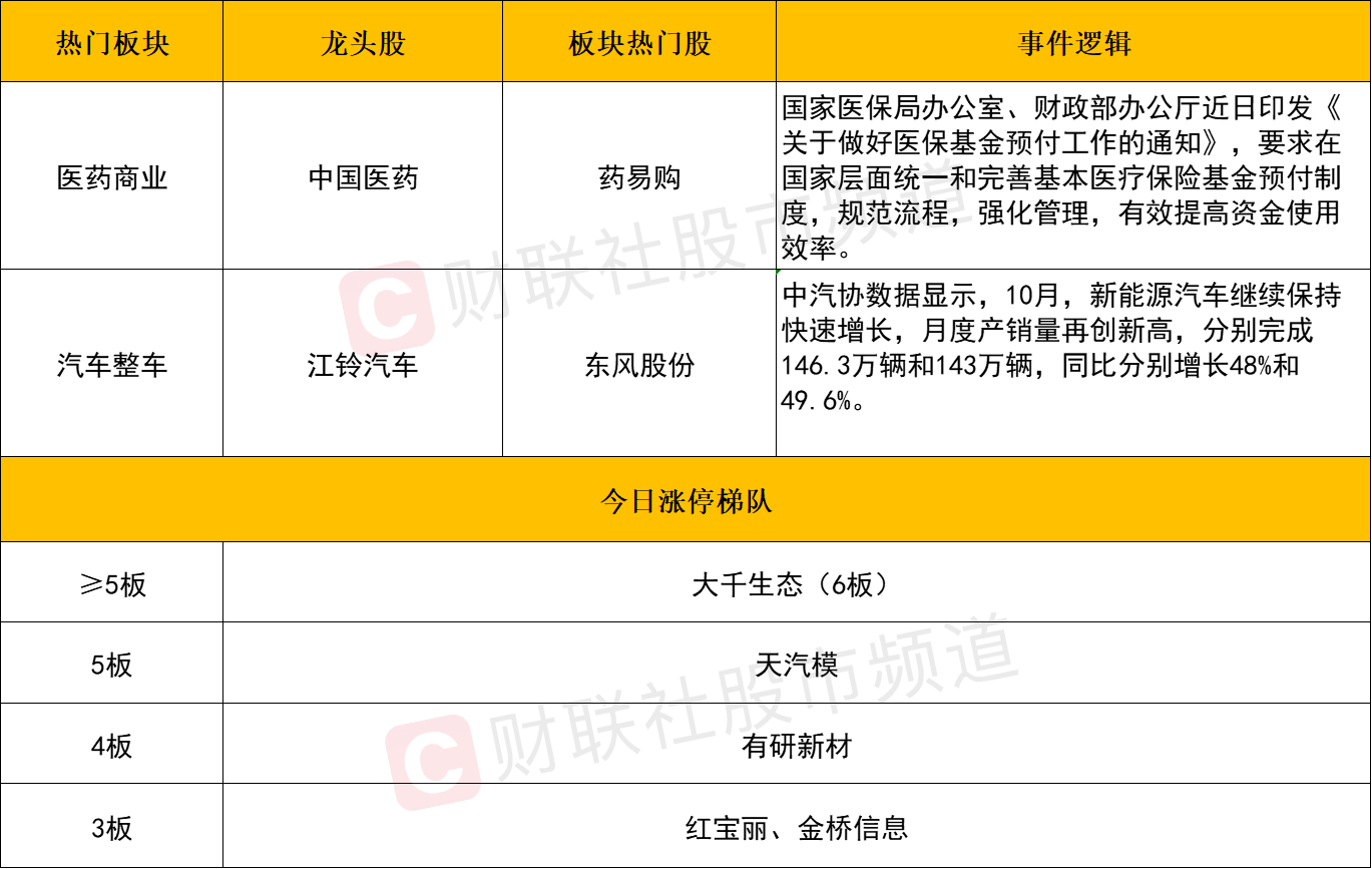 汽车整车板块局部活跃,东风股份、江铃汽车、上汽集团涨停,广汽集团、众泰汽车等个股跟涨。消息面上,中汽协数据显示,10月,新能源汽车继续保持快速增长,月度产销量再创新高,分别完成146.3万辆和143万辆,同比分别增长48%和49.6%,新能源汽车新车销量占汽车新车总销量的46.8%。