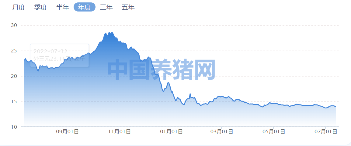 根据中国养猪网数据,一季度全国猪价围绕约15元/公斤震荡,只在春节前短暂突破过16元/公斤。二季度,猪价一直位于15元/公斤下方震荡,7月以来更是数次跌破14元/公斤。
