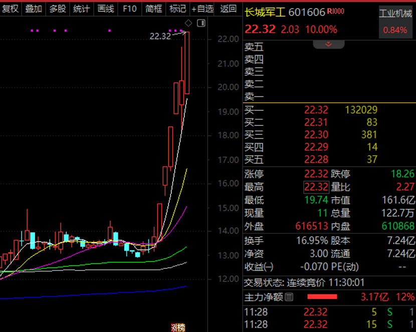 长城军工堪称概念龙头,6月18日至6月23日连续涨停。该股在今天早盘涨停后,继续朝着上市初的历史高点逼近——只要再涨5%,该股即将创出历史新高。