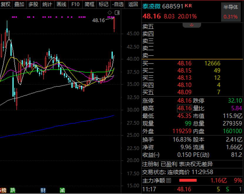 在此利好消息影响下,早盘泰凌微大幅高开,截至上午收盘,该股报48.16元,上涨20.01%,股价创出年内新高。该股甚至有望冲击上市初期的历史高点49.36元(复权后)。
