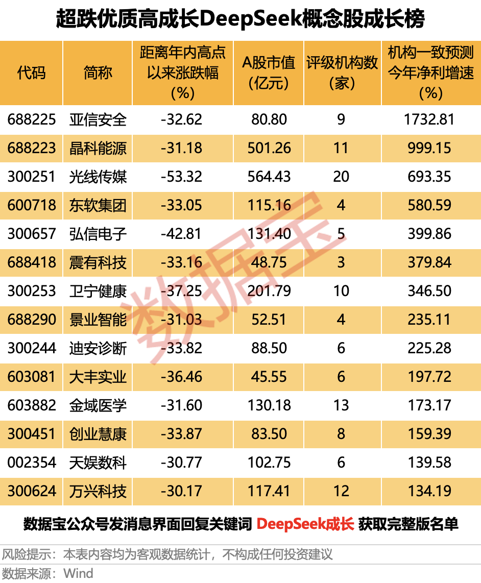 一批超跌高成长概念股引关注。据证券时报·数据宝统计,距年内高点以来跌超30%的DeepSeek概念股中,有25股评级机构数在3家以上且机构一致预测今年净利增速超100%。其中,获得9家机构评级的亚信安全机构一致预测其今年净利增速超过17倍,居首。