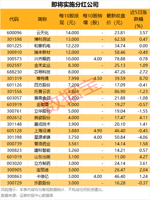 从这些公司的分红方案来看,每10股派现金额在3元(含税)及以上的共有24家,云天化派现最大方,每10股派现14元,博科测试、和泰机电、瑞丰新材、兴齐眼药等每10股派现均在10元及以上。
