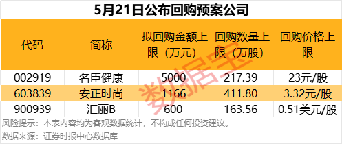 5月21日,名臣健康、安正时尚、汇丽B等3家公司披露股份回购方案。