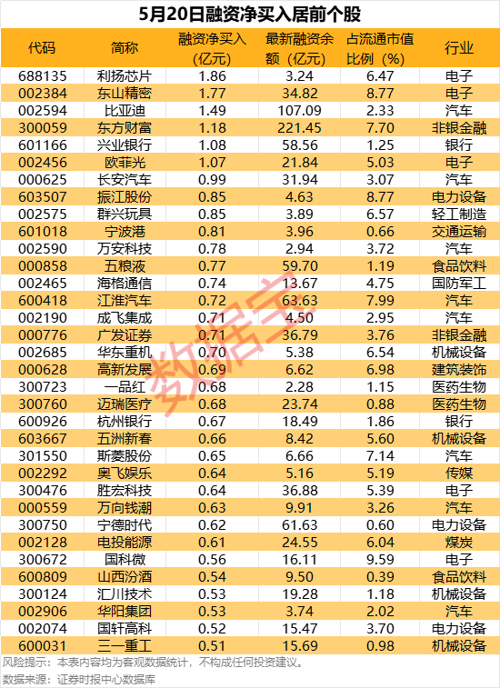 具体到个股,5月20日获融资净买入千万元以上的有342只,其中34只融资净买入额超5000万元。利扬芯片融资净买入额居首,当日净买入1.86亿元;其次是东山精密、比亚迪,融资净买入金额分别为1.77亿元、1.49亿元;融资净买入金额居前的还有东方财富、兴业银行、欧菲光等。