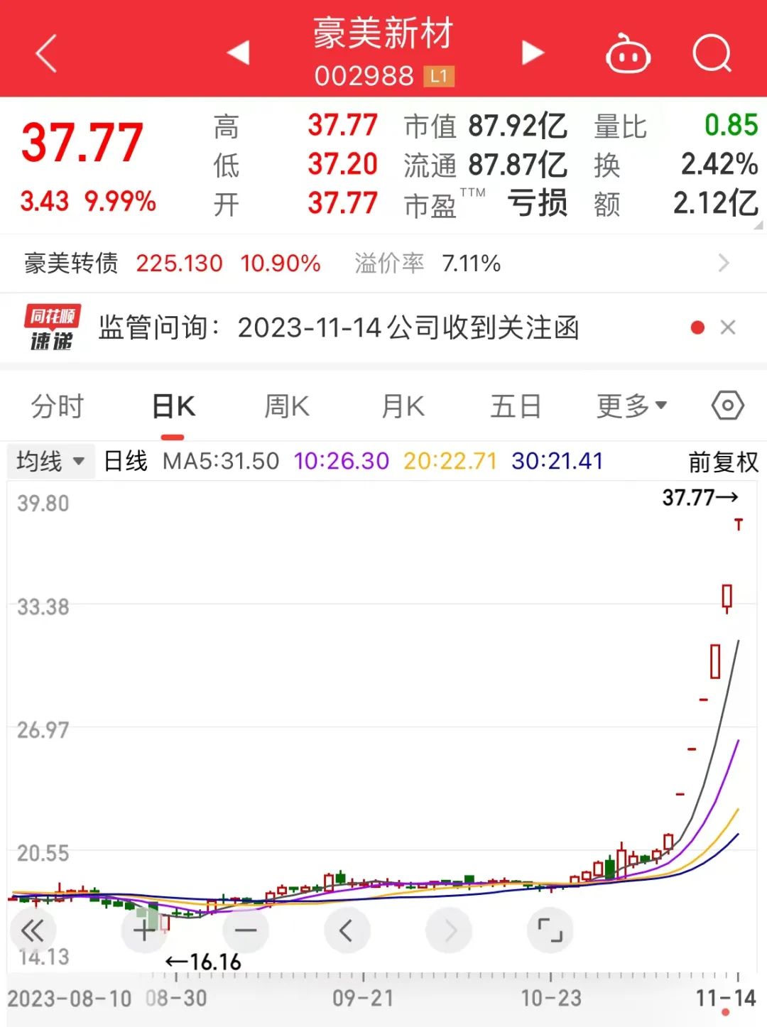 豪美新材是一家专业从事铝合金型材和系统门窗研发、设计、生产及销售的高新技术企业;公司股价自11月7日起,连续录得6个涨停。