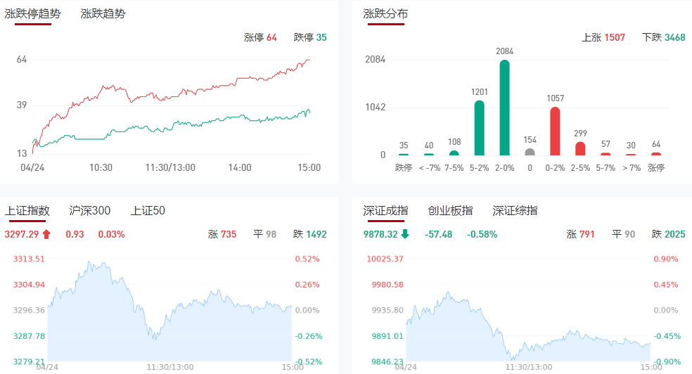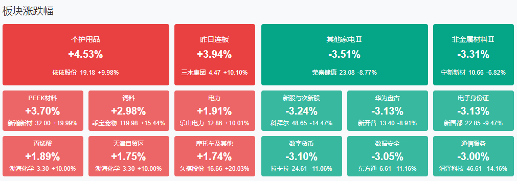 板块方面,PEEK材料、电力、宠物经济、银行等板块涨幅居前,次新股、软件开发、华为昇腾、算力等板块跌幅居前。截至收盘,沪指涨0.03%,深成指跌0.58%,创业板指跌0.68%。