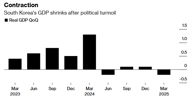 韩国经济在第一季度出现收缩,突显出在该国出口商还没有完全消化特朗普关税的影响之前,企业活动就已处于脆弱状态,这加大了韩国央行恢复降息的理由。韩国央行周四公布的数据显示,韩国一季度GDP环比下降0.2%,低于经济学家预期的增长0.1%;同比下降0.1%,低于预期的增长0.2%。去年12月初,韩国前总统宣布戒严令失败,引发了几十年来最严重的政治危机,削弱了消费者信心,随后国内需求放缓。