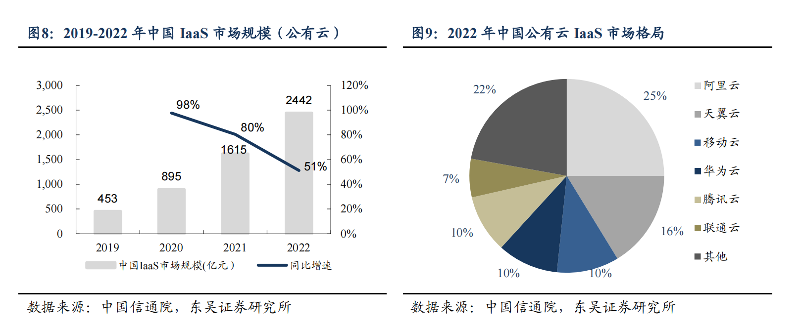 2022年中国IaaS市场规模为3413亿元。IaaS市场包括了通用计算、AI计算和超算。根据中国信通院数据,2022年中国公有云IaaS市场规模为2442亿元,测算2022年中国私有云IaaS市场规模为971亿元,则2022年中国IaaS市场规模为3413亿元。