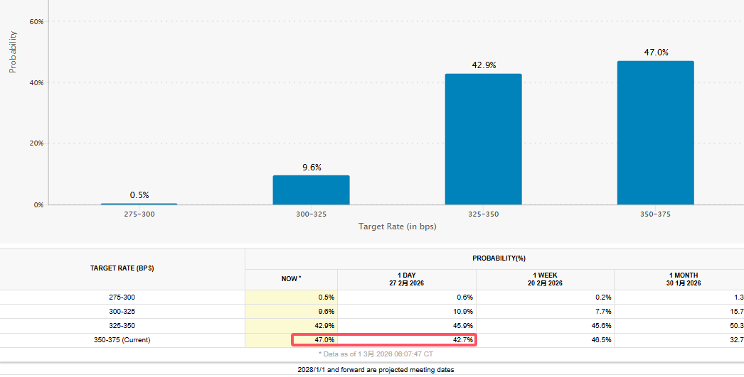 根据芝商所的FedWatch工具显示,投资者周一已进一步重新校准了利率预期,并削减了对美联储6月份启动降息的押注。目前预计6月会议维持利率不变的概率为47%,高于上周五的42.7%。