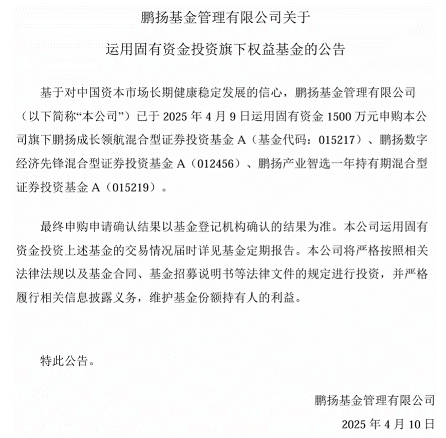 4月10日,鹏扬基金表示,公司继续执行申购1500万元,申购产品包括鹏扬成长领航混合A份额、鹏扬数字经济先锋混合A份额、鹏扬产业智选一年持有混合A份额。至此,承诺自购额度已经全部执行完毕。
