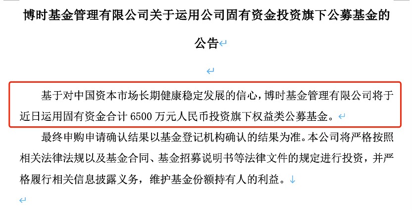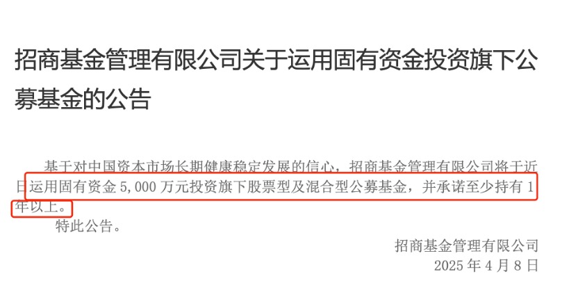 4月8日,跟随国家队护盘的还有招商系两家公募,博时基金率先公告称,基于对中国资本市场长期健康稳定发展的信心,公司将于近日运用固有资金合计6500万元投资旗下权益类公募基金。